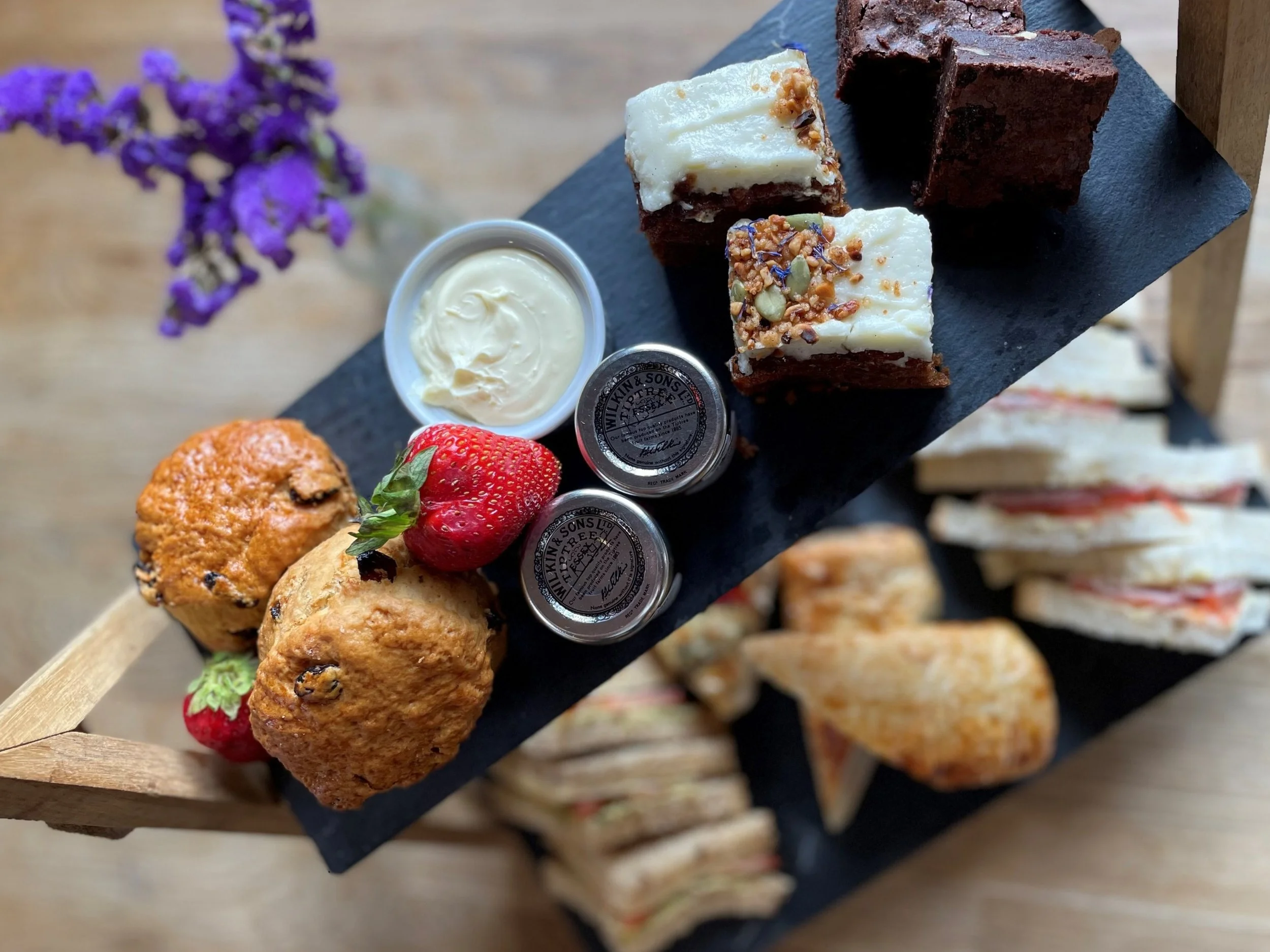 Our afternoon teas include a selection of finger sandwiches, Cobbs homemade sausage roll and quiche, scones with jam and clotted cream, and a range of sweet treats. All of this is accompanied by a refillable pot of tea.