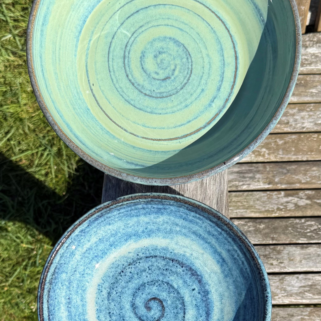 The current collection is a Danish grey stoneware with a blue rutile glaze.