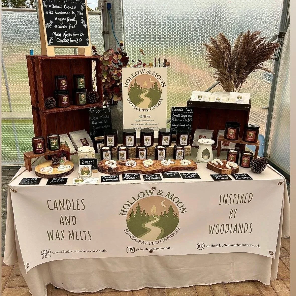 Hollow and Moon is a small candle company making candles and wax melts inspired by woodlands, nature and all things cosy. Each Hollow and Moon product is created to bring a little comfort, warmth and joy into your space, from the rich, cosy notes of Woodland Cafe, to the fresh, earthy blend of Oakmoss Trail, theres a scent for everyone, each one capturing the quiet beauty of the woodlands, and bringing the essence of the outdoors into your home. Our wax melts contain dried flowers that have been collected by hand from family gardens and allotments and dried naturally.